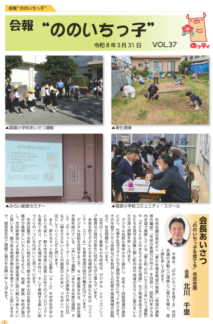 “ののいちっ子を育てる”市民会議では、毎年会報を発行しています。 令和7年発行の第37号では、『愛と和 ののいち5万人あいさつ運動』や、「子どもと大人のまちぐるみ美化清掃」、「ネットモラル啓発」などの活動について紹介しています。 (画像をクリックすると全ページ閲覧できます) 〇過去の会報 ●令和3年発行 第32号 ●令和4年発行 第33号 ●令和5年発行 第34号 ●令和6年発行 第35号 ●令和7年発行 第36号 |