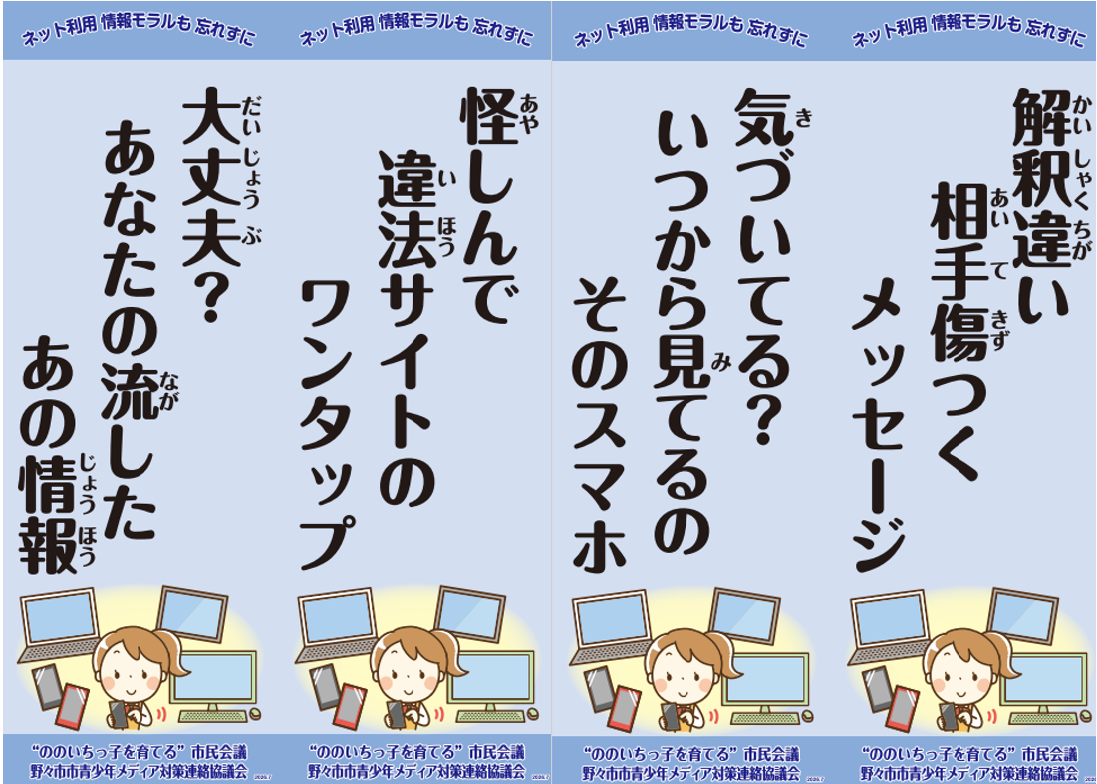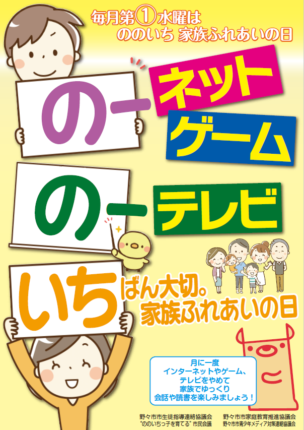 ■これまでのメディア対策事業の取り組み1 子どもや保護者、市民への啓発事業○家庭のルール作り啓発「のっティスタンド」作成・配布メディア機器利用に関するルールの必要性を啓発するペーパークラフトを配布。 令和7年度は市内小学1年生、4歳児に配布を行った。各家庭で組み立ておよび使用上のルール(20時以降は置き場所に戻す、使用は1日2時間まで等)を記入することで、メディア機器の置き場所と使用上のルールを定めるよう促す。 ![]() ○「ノーネット・ノーゲーム・ノーテレビデー」 ![]() 市生徒指導連絡協議会、市家庭教育推進協議会、市民会議、市青少年メディア対策連絡協議会などが提唱。毎月第1水曜日に実施。 今年度は時代の変化に合わせて「ノーテレビ・ノーゲームデー」から「ノ(の)ーネット・ノ(の)ーゲーム・ノーテレビ 一(いち)番大切家族ふれあいの日」とタイトルを変更し、月に一度、インターネットやゲーム、テレビをやめて親子の対話や読書を楽しむことができる子どもの育成や家庭環境づくりを行う。 ○「子どもを守ろう ネット・メディアの危険から」懸垂幕 ![]() 市役所前に掲示。 ○「ポスター」、「看板」、「卓上のぼり旗」を活用した啓発活動の推進 市内公共施設、学校、町内会掲示板等に掲示。 ネットモラル標語を中学生より募集し、ポスターを作製して小中学校に配布。